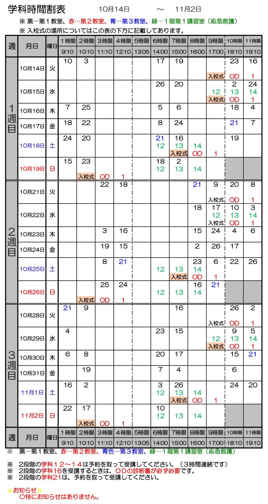 学科は3週にわたってローテーションしています。下記、日程は火曜日から日曜日までの表示です。